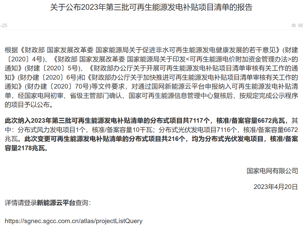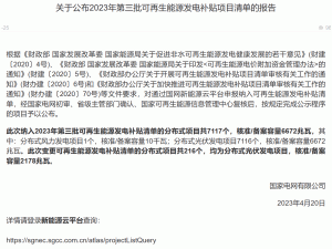 4月26日,國(guó)家電網(wǎng)關(guān)于公布2023年第三批可再生能源發(fā)電補(bǔ)貼項(xiàng)目清單的報(bào)告。此次納入2023年第三批可再生能源發(fā)電補(bǔ)貼清單的分布式項(xiàng)目共7117個(gè),核準(zhǔn)/備案容量6672兆瓦,其中:分布式風(fēng)力發(fā)電項(xiàng)目1個(gè),核準(zhǔn)/備案容量10千瓦;分布式光伏發(fā)電項(xiàng)目7116個(gè),核準(zhǔn)/備案容量6672兆瓦。此次變更可再生能源發(fā)電補(bǔ)貼