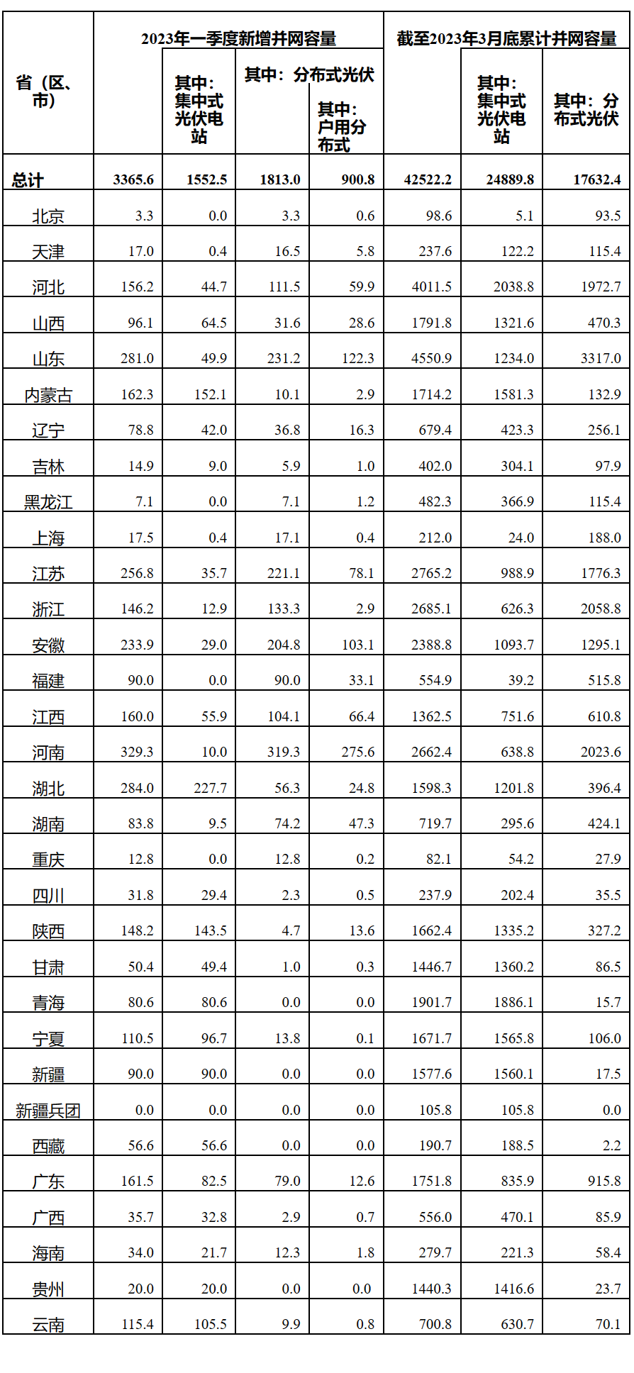 據(jù)國(guó)家能源局5月5日公布的2023年一季度光伏發(fā)電建設(shè)運(yùn)行情況,一季度新增并網(wǎng)容量3365.6萬(wàn)千瓦,集中式光伏電站1552.5萬(wàn)千瓦,分布式光伏1813萬(wàn)千瓦,戶用900.8萬(wàn)千瓦,工商業(yè)912.2萬(wàn)千瓦! 1.以上統(tǒng)計(jì)不包括港澳臺(tái)地區(qū)。