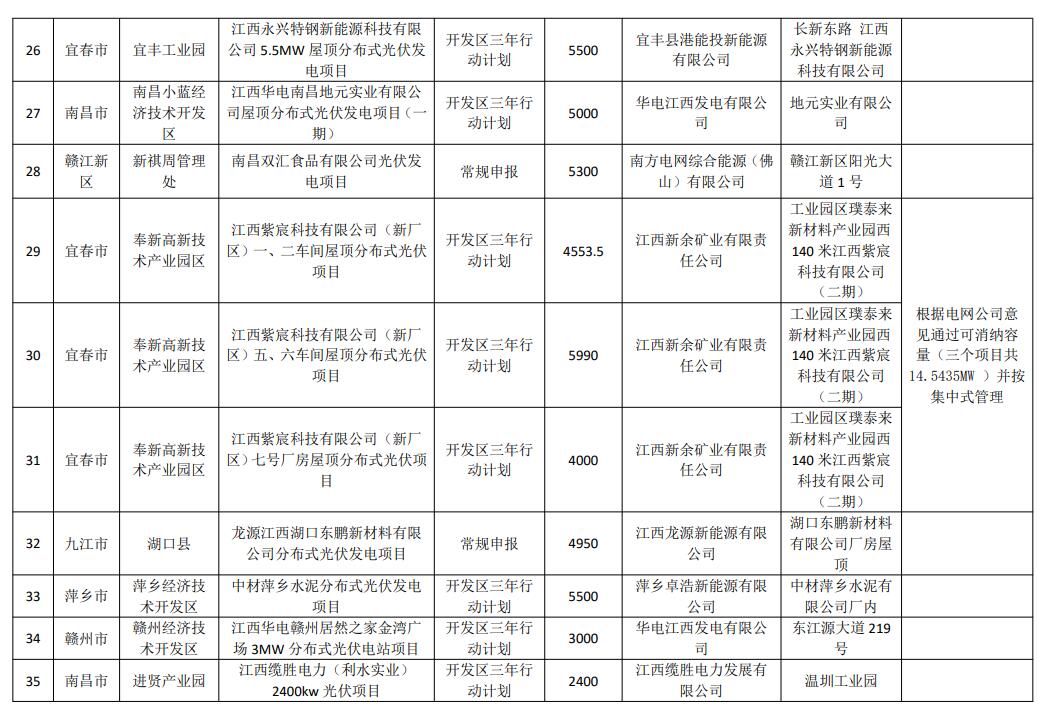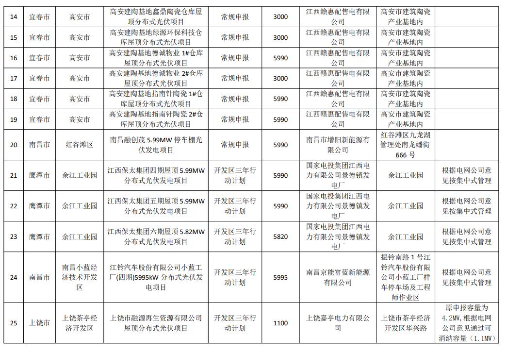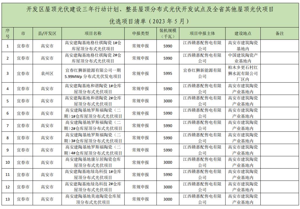 根據(jù)《江西省整體推進(jìn)開發(fā)區(qū)屋頂光伏建設(shè)三年行動計(jì)劃(2022-2024年)》(贛發(fā)改能源〔2022〕27號)與《江西省能源局關(guān)于進(jìn)一步做好整縣屋頂分布式光伏開發(fā)試點(diǎn)工作的通知》(贛能新能字〔2022〕29號)要求,江西省能源局組織開展了開發(fā)區(qū)三年行動計(jì)劃、整縣開發(fā)試點(diǎn)及全省其他屋頂光伏項(xiàng)目2023年5月競爭性優(yōu)選工作,對項(xiàng)目材料進(jìn)行合規(guī)性審查,省電網(wǎng)公司對電網(wǎng)消納材料進(jìn)行合規(guī)性審查,經(jīng)省能源局同意,現(xiàn)將優(yōu)選結(jié)果予以線上公布。各地應(yīng)在保障安全的前提下組織好項(xiàng)目建設(shè)工作,并督促已開工的項(xiàng)目在可再生能源規(guī)劃項(xiàng)目庫管理系統(tǒng)中及時(shí)更新建設(shè)進(jìn)度,及時(shí)開展建檔立卡工作。