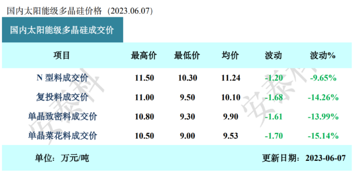 6月7日,硅業(yè)分會(huì)發(fā)布多晶硅最新價(jià)格,其中,N型料成交價(jià)10.30-11.50萬(wàn)元/噸,均價(jià)11.24萬(wàn)元/噸,周環(huán)比下降9.65%。單晶復(fù)投料成交價(jià)9.50-11.00萬(wàn)元/噸,均價(jià)10.10萬(wàn)元/噸,周環(huán)比下降14.26%。單晶致密料成交價(jià)9.30-10.80萬(wàn)元/噸,均價(jià)9.90萬(wàn)元/噸,周環(huán)比下降13.99%。單晶菜花料成交