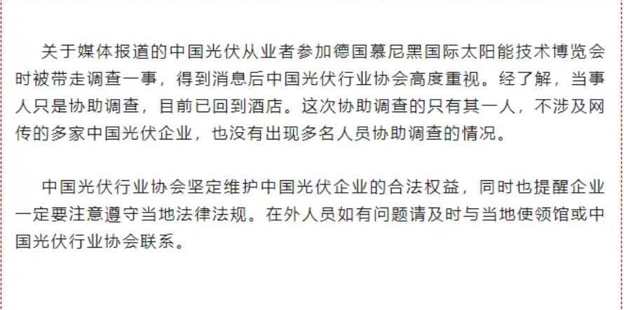 關(guān)于媒體報道的中國光伏從業(yè)者參加德國慕尼黑國際太陽能技術(shù)博覽會時被帶走調(diào)查一事,得到消息后中國光伏行業(yè)協(xié)會高度重視。經(jīng)了解,當(dāng)事人只是協(xié)助調(diào)查,目前已回到酒店。這次協(xié)助調(diào)查的只有其一人,不涉及網(wǎng)傳的多家中國光伏企業(yè),也沒有出現(xiàn)多名人員協(xié)助調(diào)查的情況。