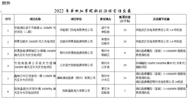 6月25日,湖北省能源局印發(fā)《省能源局關(guān)于加快風(fēng)電、光伏發(fā)電項(xiàng)目開(kāi)發(fā)建設(shè)有關(guān)工作的通知》,根據(jù)有關(guān)發(fā)電企業(yè)將鄂能源新能〔2022〕14號(hào)安排的部分建設(shè)規(guī)模明確到具體項(xiàng)目,項(xiàng)目所在地市州縣發(fā)改委(局)已審核,省電力公司已反饋意見(jiàn),F(xiàn)將具備建設(shè)條件的具體項(xiàng)目名單公布如下。