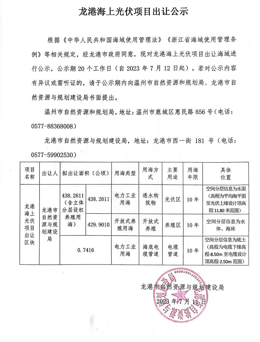 7月11日,浙江溫州市自然資源和規(guī)劃局對龍港海上光伏項(xiàng)目出讓海域進(jìn)行公示,擬出讓面積438.2611(含立體分層設(shè)權(quán)養(yǎng)殖用海)。