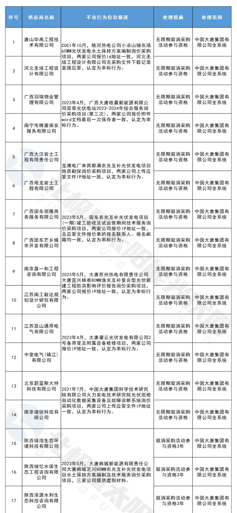 7月7日,大唐集團(tuán)發(fā)布關(guān)于供應(yīng)商不良行為處理情況的公告(2023年第8批),對(duì)出現(xiàn)弄虛作假、串標(biāo)等行為的供應(yīng)商進(jìn)行了處理。