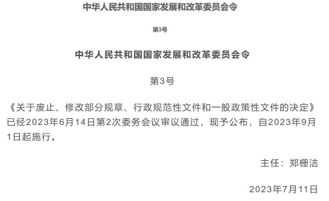 7月21日,國家發(fā)改委發(fā)布2023年3號令!蛾P(guān)于廢止、修改部分規(guī)章、行政規(guī)范性文件和一般政策性文件的決定》已經(jīng)2023年6月14日第2次委務(wù)會議審議通過,現(xiàn)予公布,自2023年9月1日起施行。