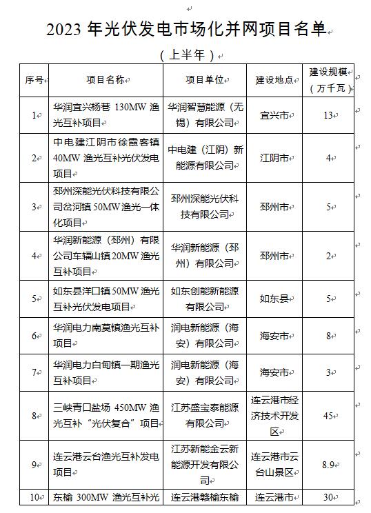 2.57GW!江蘇公布2023年上半年光伏發(fā)電市場化并網(wǎng)項(xiàng)目名單