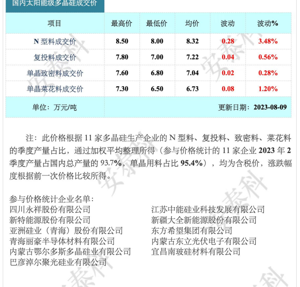 本周硅料市場主流成交價持穩(wěn)微漲,N型硅料漲幅超過P型硅料。本周有新訂單的企業(yè)數(shù)量為6家,部分企業(yè)表示8月簽單已經(jīng)完成,目前僅有少量成交。由于市場供應(yīng)相對緊張,部分企業(yè)成交價出現(xiàn)明顯上漲,并帶動本周硅料價格微漲。