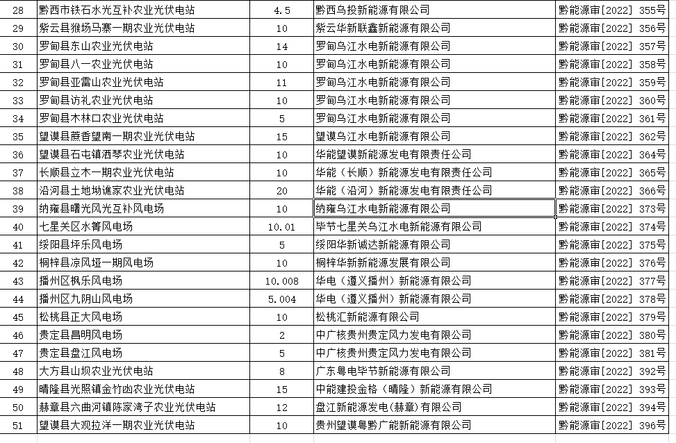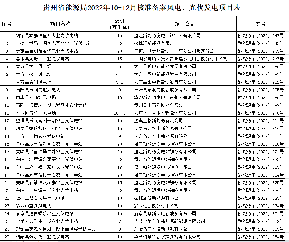 貴州公布2022年10-12月核準(zhǔn)備案風(fēng)電光伏發(fā)電項目名單