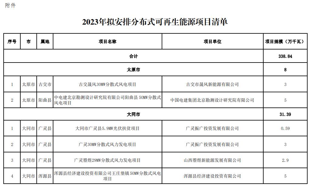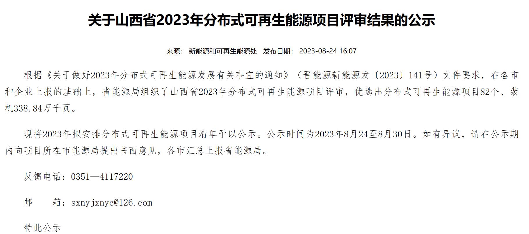 8月24日,山西省能源局公布了2023年分布式可再生能源項(xiàng)目評(píng)審結(jié)果,在各市和企業(yè)上報(bào)的基礎(chǔ)上,省能源局組織了山西省2023年分布式可再生能源項(xiàng)目評(píng)審,優(yōu)選出分布式可再生能源項(xiàng)目82個(gè)、裝機(jī)338.84萬(wàn)千瓦。。其中光伏42.23萬(wàn)千瓦,風(fēng)電296.61萬(wàn)千瓦。