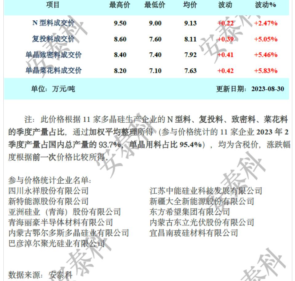 本周國(guó)內(nèi)N型硅料價(jià)格區(qū)間在9-9.5萬(wàn)元/噸,成交均價(jià)為9.13萬(wàn)元/噸,周環(huán)比漲幅為2.47%,單晶致密料區(qū)間在7.4-8.4萬(wàn)元/噸,成交均價(jià)為7.92,周環(huán)比漲幅為5.46%。