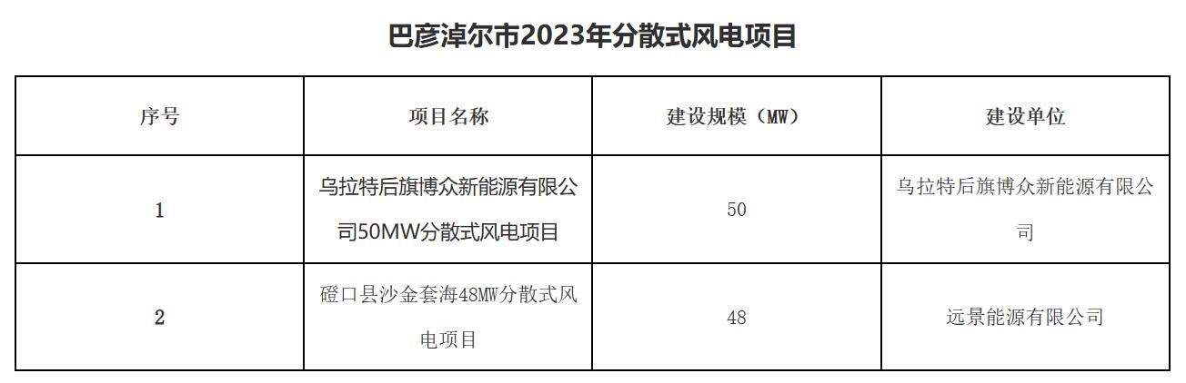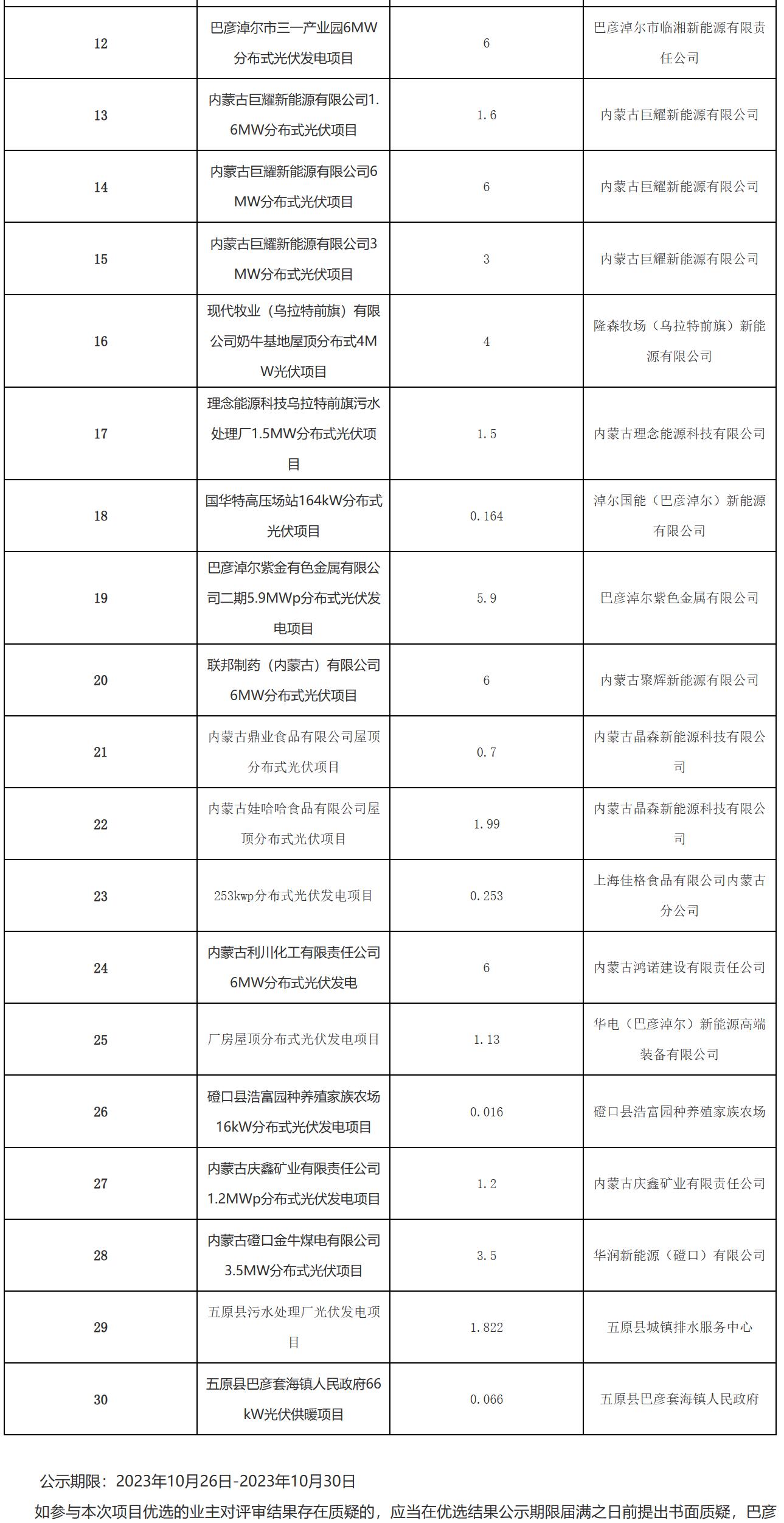 26日,巴彥淖爾市政府發(fā)布關(guān)于對(duì)2023年巴彥淖爾市分散式風(fēng)電、分布式光伏項(xiàng)目?jī)?yōu)選結(jié)果的公示。公示期限:2023年10月26日-2023年10月30日