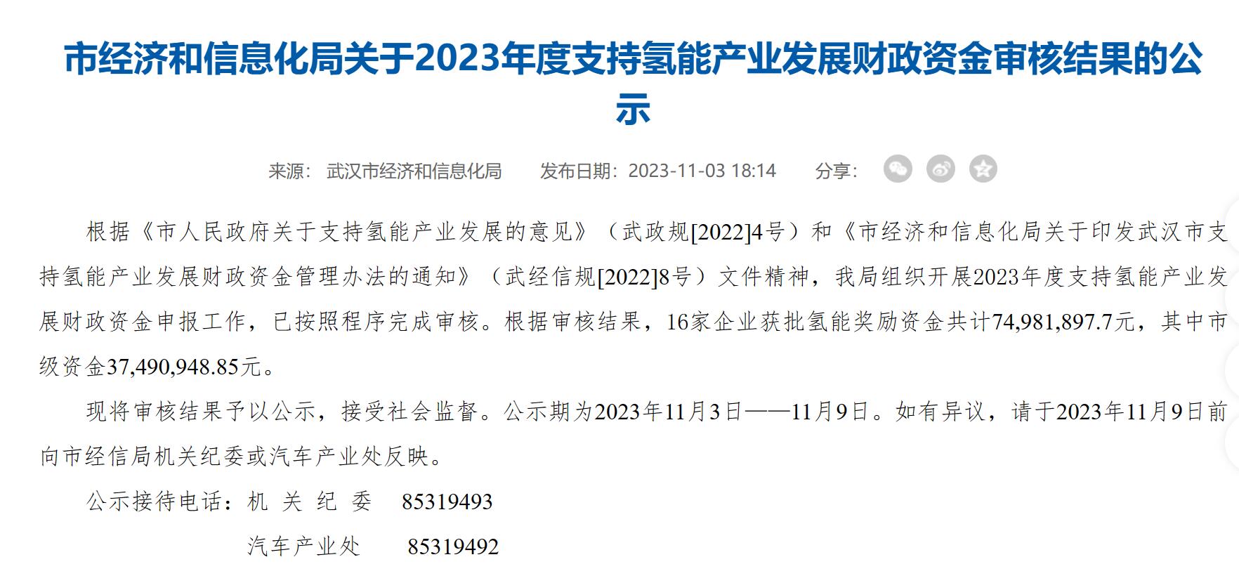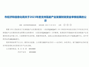 武漢市經(jīng)濟(jì)和信息化局關(guān)于2023年度支持氫能產(chǎn)業(yè)發(fā)展財政資金審核結(jié)果的公示