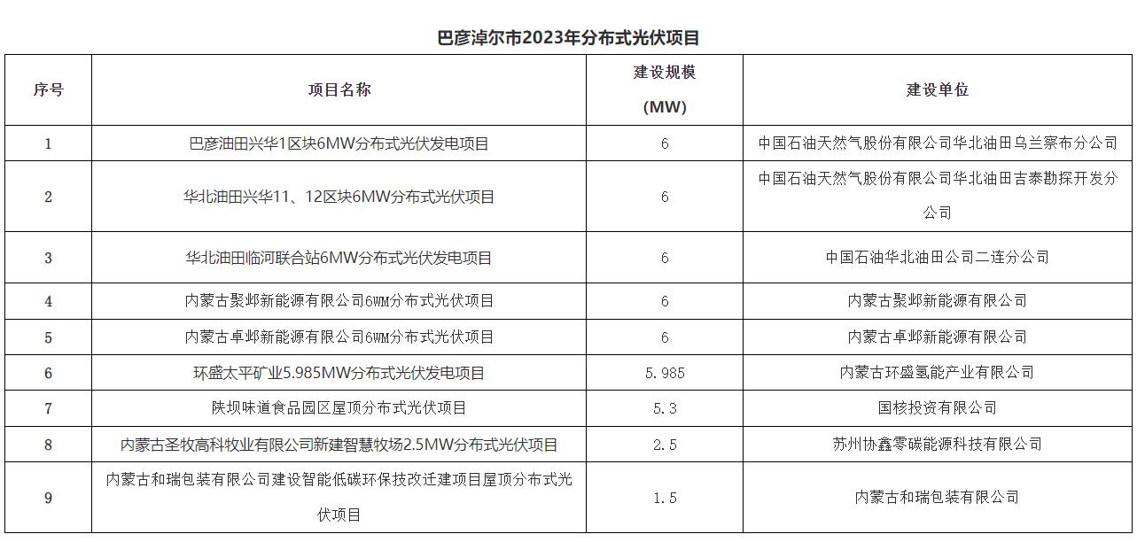 關(guān)于對(duì)2023年巴彥淖爾市補(bǔ)充申報(bào)分布式光伏項(xiàng)目?jī)?yōu)選結(jié)果的公示,共補(bǔ)充9個(gè)分布式光伏項(xiàng)目,總裝機(jī)規(guī)模45.285MW。