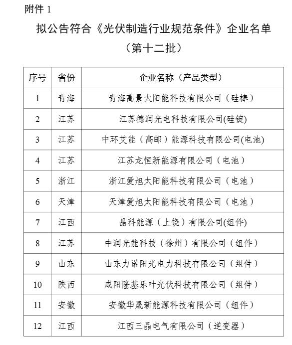 12月6日,工信部發(fā)布擬公告符合《光伏制造行業(yè)規(guī)范條件》企業(yè)名單(第十二批)和擬撤銷光伏制造行業(yè)規(guī)范公告企業(yè)名單(第七批)公示文件。