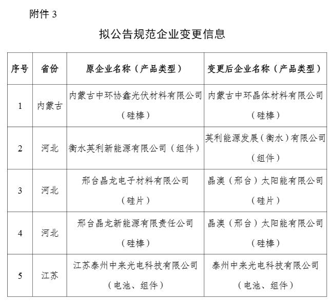 京瓷(天津)太陽能有限公司等14家已公告企業(yè),因不能保持規(guī)范條件要求,擬撤銷其規(guī)范企業(yè)資格(見附件2);內(nèi)蒙古中環(huán)協(xié)鑫光伏材料有限公司等5家企業(yè)名稱發(fā)生變更,擬更新有關公告信息(詳見附件3),以上信息一并予以公示。