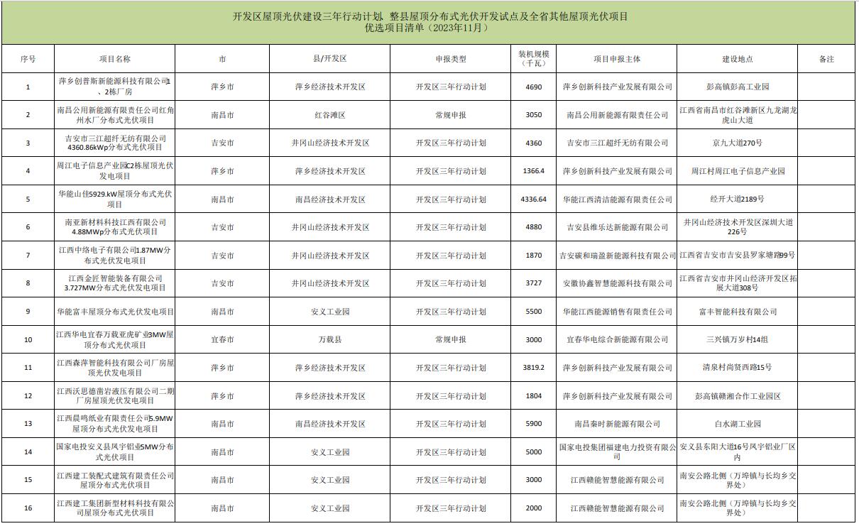 根據(jù)《江西省整體推進(jìn)開發(fā)區(qū)屋頂光伏建設(shè)三年行動(dòng)計(jì)劃(2022-2024年)》與《江西省能源局關(guān)于進(jìn)一步做好整縣屋頂分布式光伏開發(fā)試點(diǎn)工作的通知》要求,江西省能源局組織開展了開發(fā)區(qū)三年行動(dòng)計(jì)劃、整縣開發(fā)試點(diǎn)及全省其他屋頂光伏項(xiàng)目2023年11月競(jìng)爭(zhēng)性優(yōu)選工作,江西省可再生能源信息中心對(duì)項(xiàng)目材料進(jìn)行合規(guī)性審查,省電網(wǎng)公司對(duì)電網(wǎng)消納材料進(jìn)行合規(guī)性審查,經(jīng)省能源局同意,現(xiàn)將優(yōu)選結(jié)果予以線上公布。