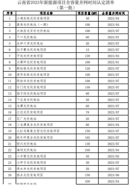 云南省能源局會(huì)同有關(guān)部門(mén)和發(fā)電企業(yè)共同確定了《云南省新能源項(xiàng)目全容量并網(wǎng)時(shí)間技術(shù)認(rèn)定指南(試行)》,并由云南電網(wǎng)公司組織開(kāi)展全容量并網(wǎng)時(shí)間技術(shù)認(rèn)定工作。我局收到云南電網(wǎng)公司提交的24家發(fā)電企業(yè)共89個(gè)項(xiàng)目技術(shù)認(rèn)定報(bào)告,經(jīng)認(rèn)真復(fù)核,同時(shí)征求了云南省發(fā)展和改革委員會(huì)、國(guó)家能源局云南監(jiān)管辦的意見(jiàn),形成了《2023年新能源項(xiàng)目全容量并網(wǎng)時(shí)間認(rèn)定清單(第一批)》,F(xiàn)對(duì)2023年第一批89個(gè)項(xiàng)目的名稱(chēng)、容量、全容量并網(wǎng)時(shí)間等信息進(jìn)行公示。