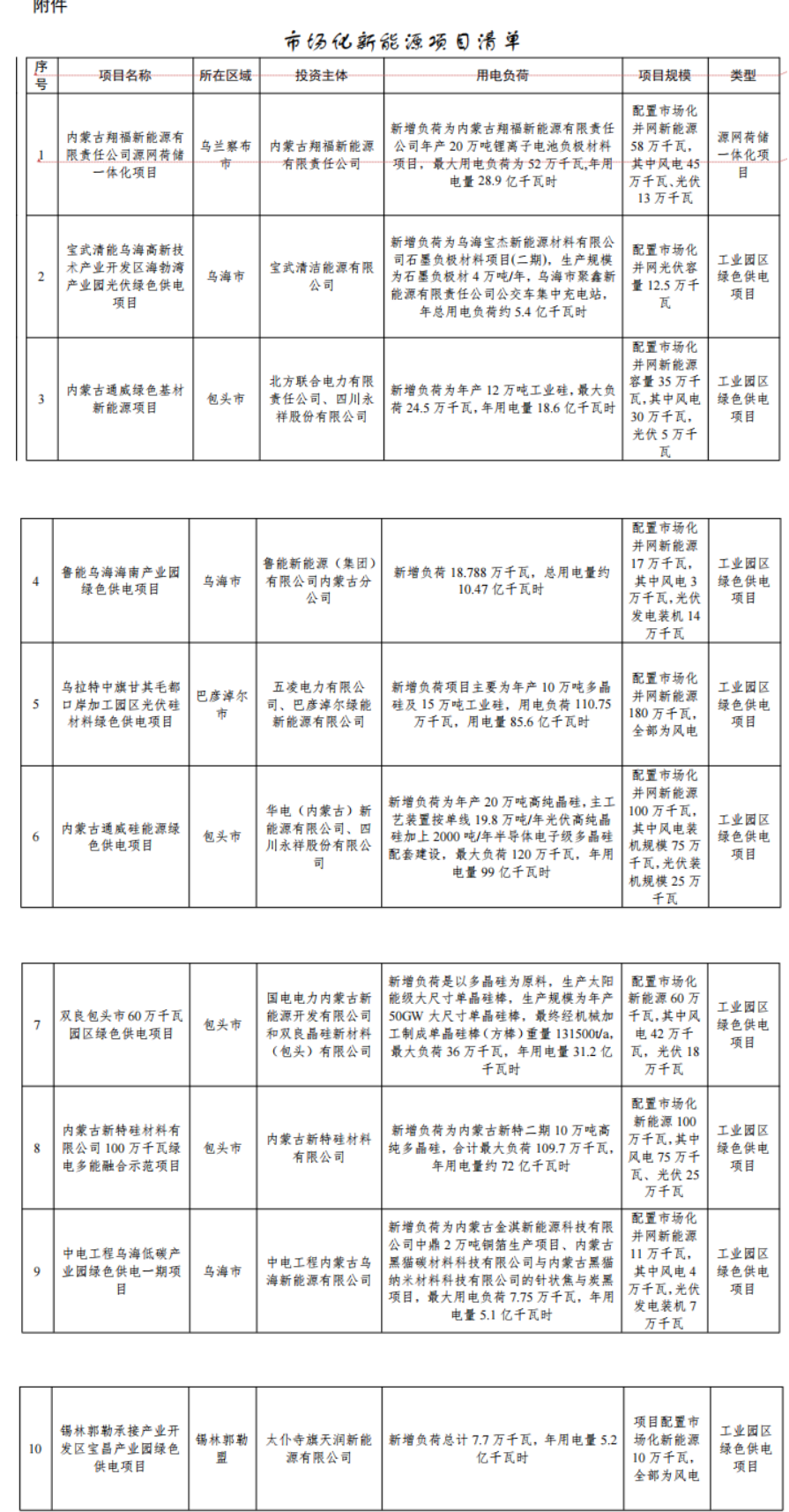 按照《內(nèi)蒙古自治區(qū)工業(yè)園區(qū)綠色供電項(xiàng)目實(shí)施細(xì)則2023年版(試行)》《內(nèi)蒙古自治區(qū)源網(wǎng)荷儲(chǔ)一體化項(xiàng)目實(shí)施細(xì)則2023年版(試行)》有關(guān)要求,內(nèi)蒙古自治區(qū)能源局同意實(shí)施內(nèi)蒙古翔福新能源有限責(zé)任公司源網(wǎng)荷儲(chǔ)一體化項(xiàng)目、寶武清能烏海高新技術(shù)產(chǎn)業(yè)開(kāi)發(fā)區(qū)海勃灣產(chǎn)業(yè)園光伏綠色供電項(xiàng)目、內(nèi)蒙古通威綠色基材新能源項(xiàng)目、魯能烏海海南產(chǎn)業(yè)園綠色供電項(xiàng)目、烏拉特中旗甘其毛都口岸加工園區(qū)光伏硅材料綠色供電項(xiàng)目、內(nèi)蒙古通威硅能源綠色供電項(xiàng)目、雙良包頭市園區(qū)綠色供電項(xiàng)目、內(nèi)蒙古新特硅材料有限公司綠電多能融合示范項(xiàng)目、中電工程烏海低碳產(chǎn)業(yè)園綠色供電一期項(xiàng)目、錫林郭勒承接產(chǎn)業(yè)開(kāi)發(fā)區(qū)寶昌產(chǎn)業(yè)園綠色供電項(xiàng)目,總計(jì)新能源規(guī)模583.5萬(wàn)千瓦,現(xiàn)將有關(guān)要求通知如下。