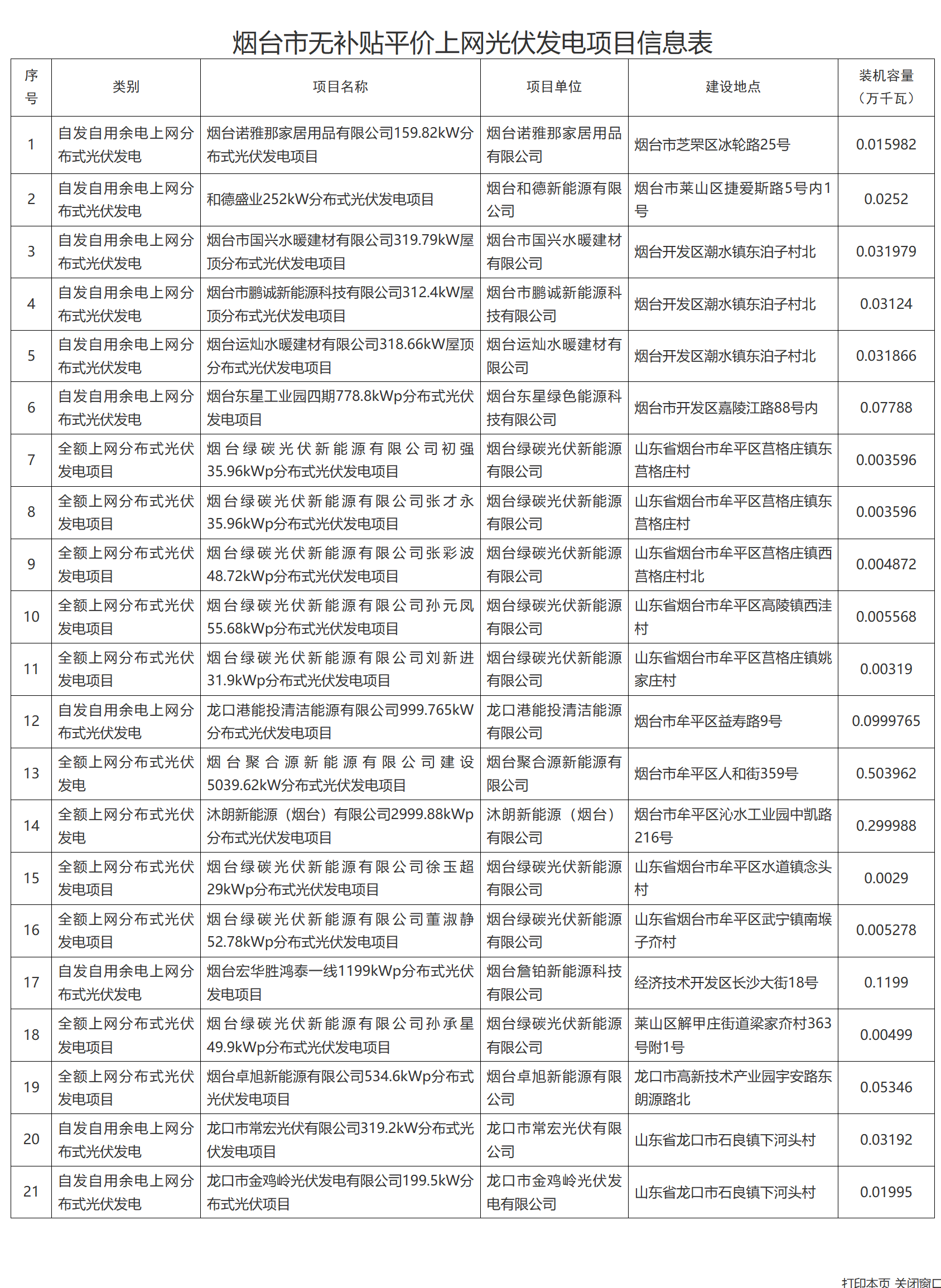 煙臺確認1月份第1批21個平價上網(wǎng)光伏發(fā)電項目