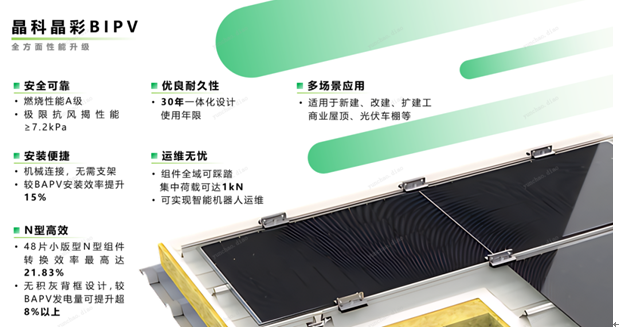 晶科晶彩BIPV光伏壓型鋼板構(gòu)件不僅具有高效的發(fā)電性能,同時(shí)具有優(yōu)異的安全可靠的建筑屬性。采用自研夾具安裝,支持全域可踩踏特性,具有30年一體化壽命。解決傳統(tǒng)分布式光伏裝機(jī)量低、與建筑壽命不同步、防水、防火、抗風(fēng)性能差、不可踩踏等問題。晶科深入系統(tǒng)的研究光伏屋面可踩踏性能并形成多項(xiàng)國際發(fā)明專利及國際標(biāo)準(zhǔn)提案,國際首創(chuàng)BIPV組件接線頭懸空固定方式及專利線卡,有效防止直流拉弧、燒穿屋面的風(fēng)險(xiǎn)。產(chǎn)品低成本高收益、安全可靠,經(jīng)濟(jì)效益、社會(huì)效益顯著。多項(xiàng)技術(shù)處于國內(nèi)領(lǐng)先水平。