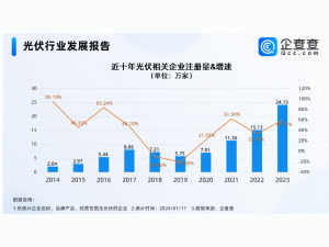 企查查數(shù)據(jù)顯示,我國(guó)現(xiàn)存光伏相關(guān)企業(yè)80.35萬家。近十年,我國(guó)光伏相關(guān)企業(yè)注冊(cè)量整體呈顯著增長(zhǎng)態(tài)勢(shì)。近三年,我國(guó)光伏相關(guān)企業(yè)注冊(cè)量迎來高速增長(zhǎng)時(shí)期,2021年—2023年,我國(guó)光伏相關(guān)企業(yè)分別新增11.36萬家、15.13萬家、24.15萬家,同比增長(zhǎng)61.98%、33.26%、59.57%。
