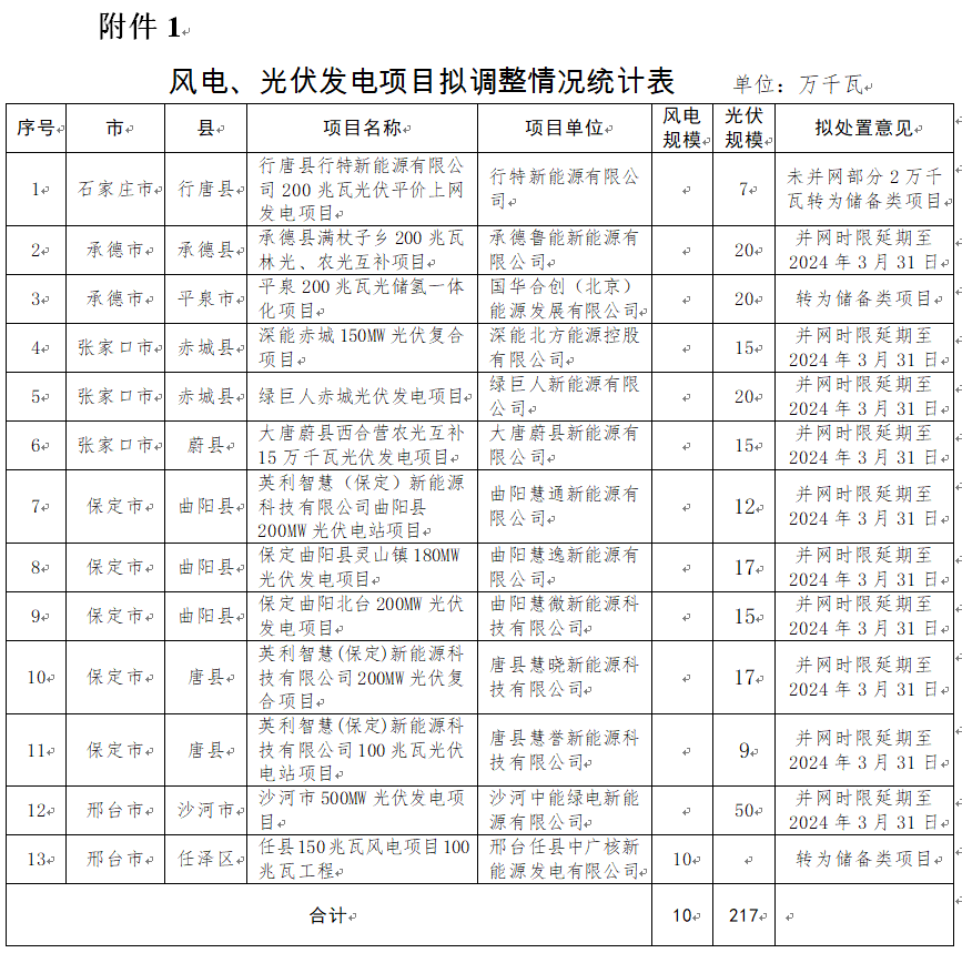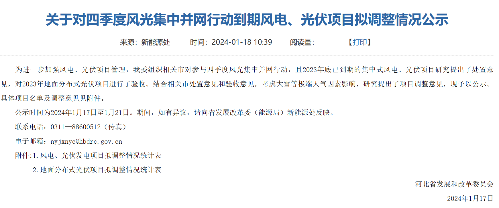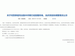 1月18日,河北省發(fā)展和改革委員會(huì)發(fā)布《關(guān)于對(duì)四季度風(fēng)光集中并網(wǎng)行動(dòng)到期風(fēng)電、光伏項(xiàng)目擬調(diào)整情況公示》,經(jīng)組織相關(guān)市對(duì)參與四季度風(fēng)光集中并網(wǎng)行動(dòng),且2023年底已到期的集中式風(fēng)電、光伏項(xiàng)目研究提出了處置意見,對(duì)2023年地面分布式光伏項(xiàng)目進(jìn)行了驗(yàn)收。結(jié)合相關(guān)市處置意見和驗(yàn)收意見,考慮大雪等極端天氣因素影響,研究提出了項(xiàng)目調(diào)整意見,現(xiàn)予以公示。