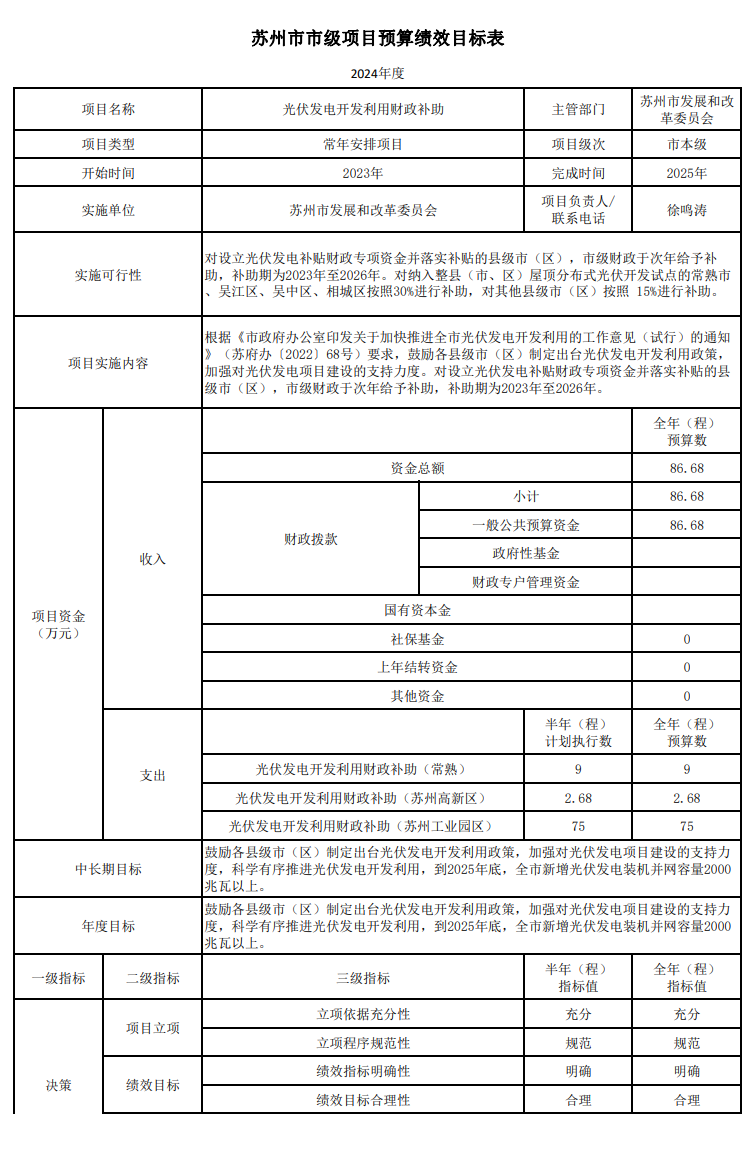 2月22日,蘇州市發(fā)展和改革委員會公布2024年市級項目預(yù)算績效目標表,共計八項,其中包含光伏發(fā)電開發(fā)利用財政補助。