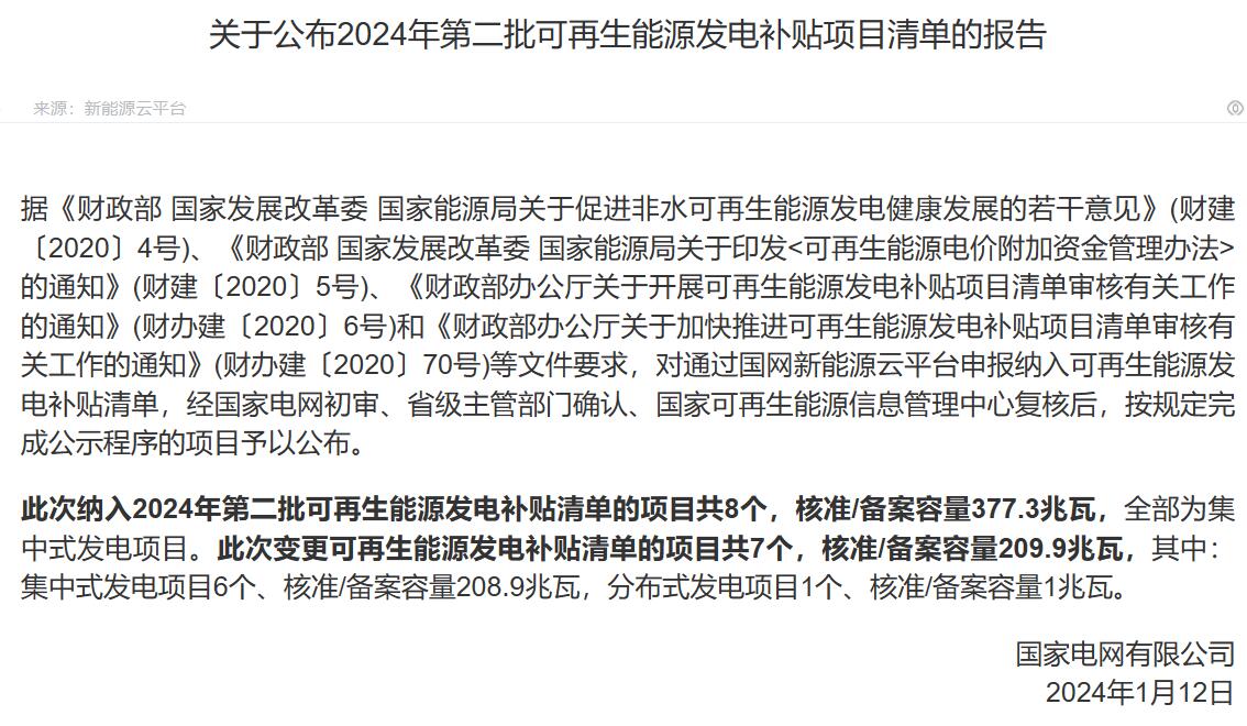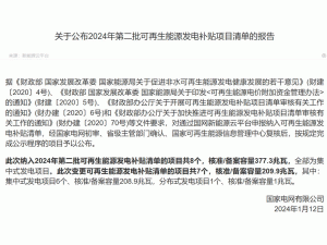 3月4日,國家電網(wǎng)新能源云平臺(tái)發(fā)布2024年第二批可再生能源發(fā)電補(bǔ)貼項(xiàng)目清單報(bào)告。