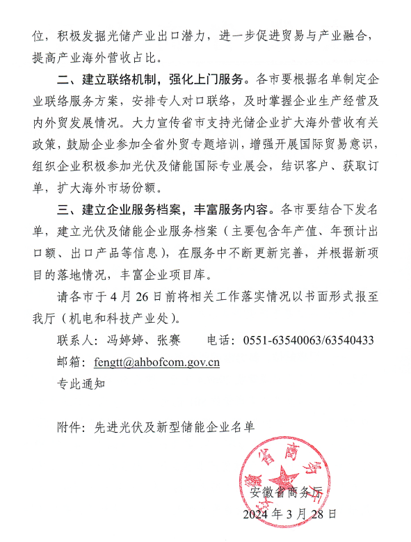 安徽省商務(wù)廳消息:4月1日,安徽省商務(wù)廳印發(fā)關(guān)于加強(qiáng)對先進(jìn)光伏及新型儲能生產(chǎn)型企業(yè)跟蹤服務(wù)的通知,強(qiáng)調(diào)要積極發(fā)掘光儲產(chǎn)業(yè)出口潛力,及時掌握企業(yè)生產(chǎn)經(jīng)營及內(nèi)外貿(mào)發(fā)展情況,建立光伏及儲能企業(yè)服務(wù)檔案,進(jìn)一步促進(jìn)貿(mào)易與產(chǎn)業(yè)融合:提高產(chǎn)業(yè)海外營收占比。