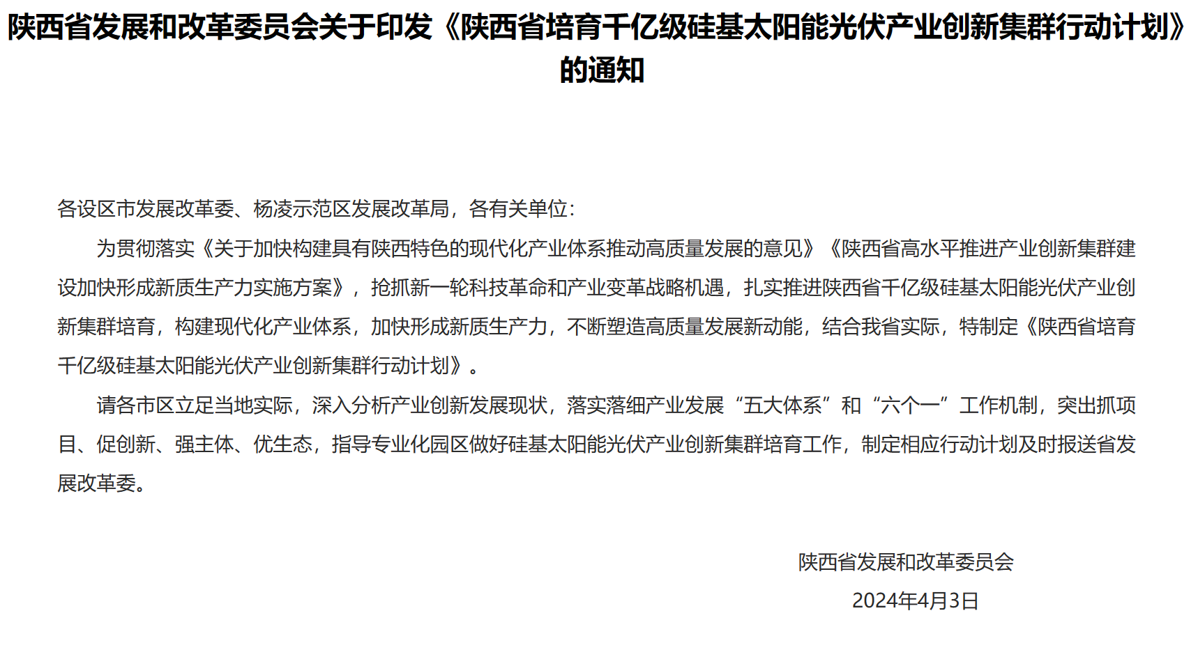 陜西省培育千億級硅基太陽能光伏產(chǎn)業(yè)創(chuàng)新集群行動計劃