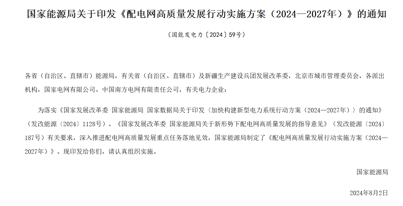 8月13日,國(guó)家能源局發(fā)布關(guān)于印發(fā)《配電網(wǎng)高質(zhì)量發(fā)展行動(dòng)實(shí)施方案(2024—2027年)》的通知,要求深入推進(jìn)配電網(wǎng)高質(zhì)量發(fā)展重點(diǎn)任務(wù)落地見(jiàn)效。