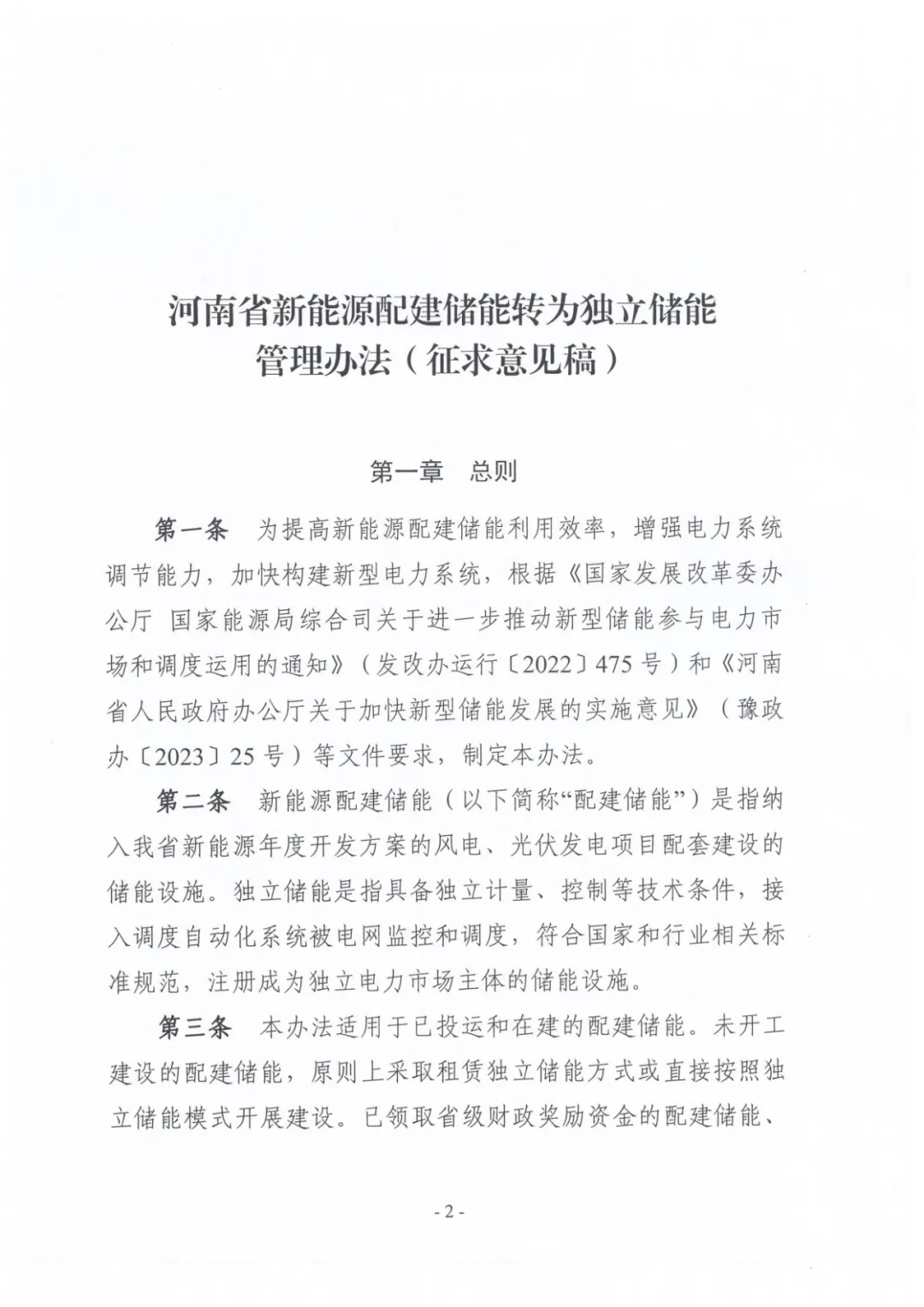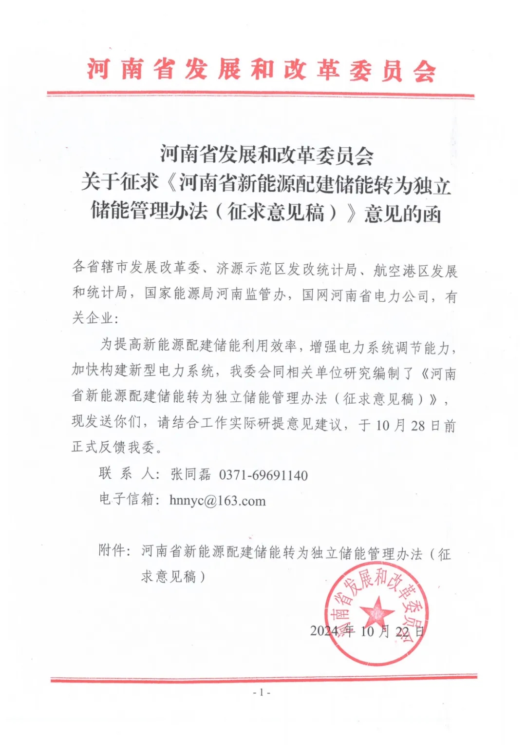 10月22日,河南省發(fā)改委印發(fā)關于征求《河南省新能源配建儲能轉為獨立儲能管理辦法(征求意見稿)》意見的函,擬將新能源配套建設的儲能設施轉化為獨立儲能項目管理,并享受獨立儲能政策。