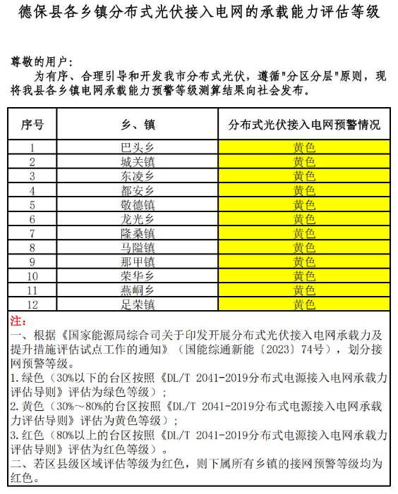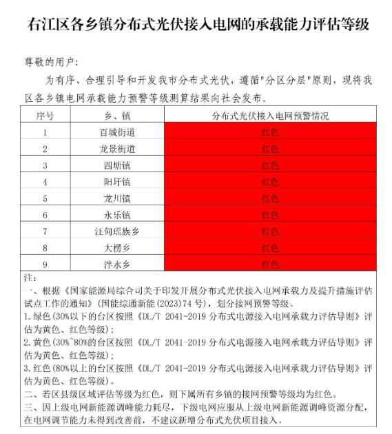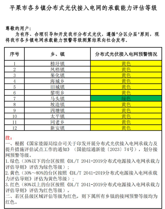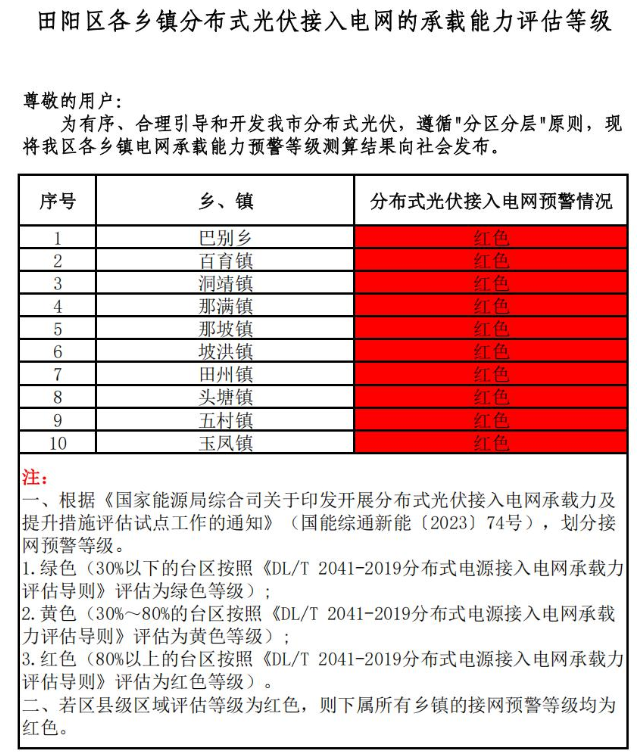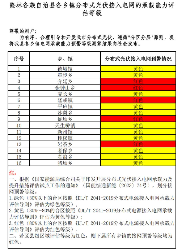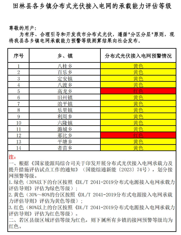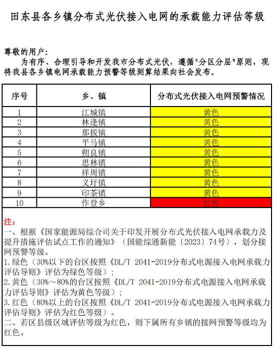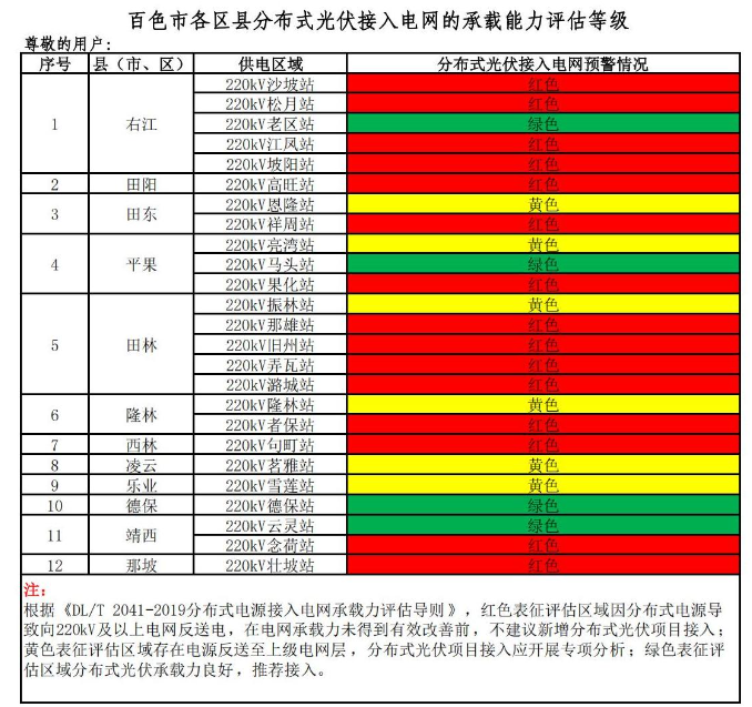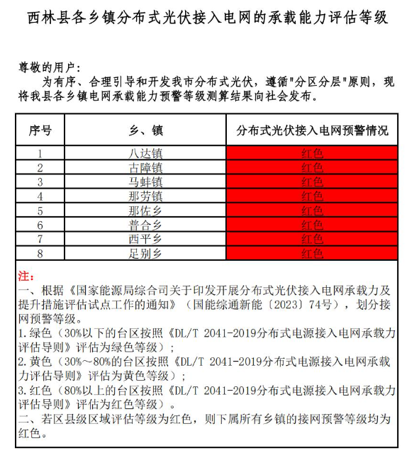 為貫徹落實(shí)國(guó)家、自治區(qū)優(yōu)化營(yíng)商環(huán)境有關(guān)決策部署,推進(jìn)優(yōu)化營(yíng)商環(huán)境提質(zhì)增效,促進(jìn)分布式光伏高效消納,助力分布式光伏市場(chǎng)健康有序發(fā)展。根據(jù)《國(guó)家能源局綜合司關(guān)于印發(fā)開(kāi)展分布式光伏接入電網(wǎng)承載力及提升措施評(píng)估試點(diǎn)工作的通知》(國(guó)能綜通新能〔2023〕74號(hào))、DLT2041-2019分布式電源接入電網(wǎng)承載力評(píng)估導(dǎo)則,我委組織百色供電局、百色能源集團(tuán)對(duì)本企業(yè)營(yíng)業(yè)區(qū)內(nèi)縣(市、區(qū))電網(wǎng)接納分布式光伏能力進(jìn)行承載力評(píng)估,測(cè)算我市各縣(市、區(qū))、開(kāi)發(fā)區(qū)電網(wǎng)承載能力預(yù)警等級(jí),分為綠色、黃色、紅色三個(gè)等級(jí)。
