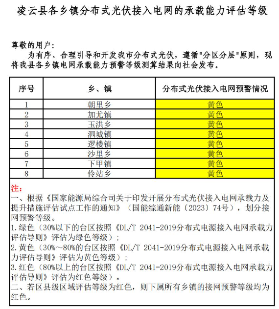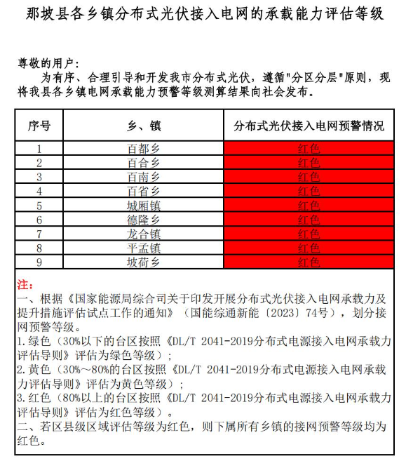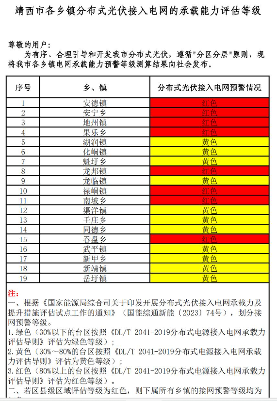 現(xiàn)我委將2025年第一季度各縣(市、區(qū))分布式光伏接入電網(wǎng)的承載能力評(píng)估等級(jí)結(jié)果向社會(huì)發(fā)布。請(qǐng)各分布式光伏開(kāi)發(fā)建設(shè)企業(yè)在投資分布式光伏項(xiàng)目前,充分結(jié)合投資區(qū)域電網(wǎng)承載能力預(yù)警等級(jí)測(cè)算結(jié)果進(jìn)行評(píng)估,避免因電網(wǎng)承載能力受限導(dǎo)致項(xiàng)目無(wú)法按期并網(wǎng)。