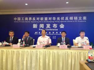 2012年8月22日,中國工商界的行業(yè)組織全聯(lián)新能源商會在京召開新聞發(fā)布會, 堅決反對歐盟對華光伏產(chǎn)品反傾銷立案,呼吁歐方盡快來華磋商,對話解決貿(mào)易爭端。來自新能源商會的通威集團董事局主席劉漢元、保利協(xié)鑫COO鄒西原、中電光伏CEO蔡志方和西安隆基CEO鐘寶申等著名光伏企業(yè)領(lǐng)導(dǎo)人出席新聞發(fā)布會,并回答了記者提問。漢能控股集團、天合光能、應(yīng)用材料、浙江昱輝、晶科能源、英利綠色能源和雷利新能源等知名企業(yè)的代表也參加了會議。出席會議的還有來自新能源商會其他光伏企業(yè)的代表、國內(nèi)外權(quán)威媒體、歐盟及相關(guān)國家駐華使領(lǐng)館和機構(gòu)代表共100余人。