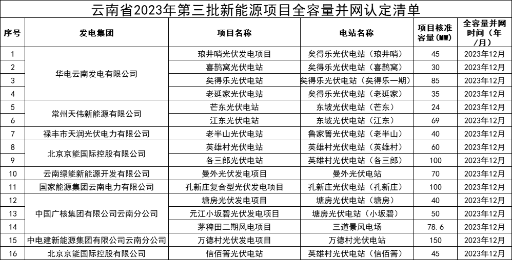 9月3日,云南省能源局發(fā)布2023年第三批新能源項(xiàng)目全容量并網(wǎng)時(shí)間認(rèn)定清單,共計(jì)16個(gè)項(xiàng)目。