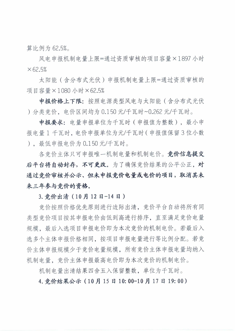 10月10日10:00開(kāi)始競(jìng)價(jià)申報(bào),競(jìng)價(jià)按風(fēng)電、太陽(yáng)能兩類(lèi)分別組織。競(jìng)價(jià)主體應(yīng)在規(guī)定時(shí)間內(nèi)完成競(jìng)價(jià)申報(bào)。