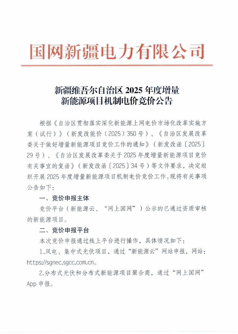 9月30日,新疆國(guó)網(wǎng)發(fā)布2025年度增量新能源項(xiàng)目機(jī)制電價(jià)競(jìng)價(jià)公告。