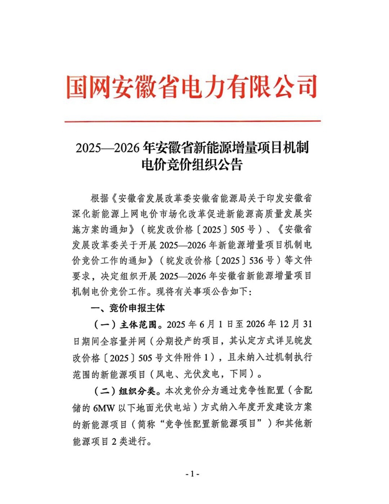 10月13日,新能源云平臺公布2025-2026年安徽省新能源增量項(xiàng)目機(jī)制電價競價組織公告。