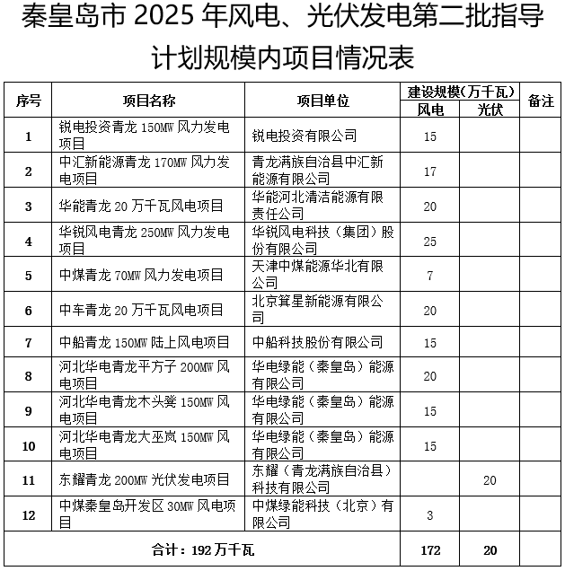 秦皇島市2025年風光發(fā)電第二批指導計劃規(guī)模內項目出庫公示