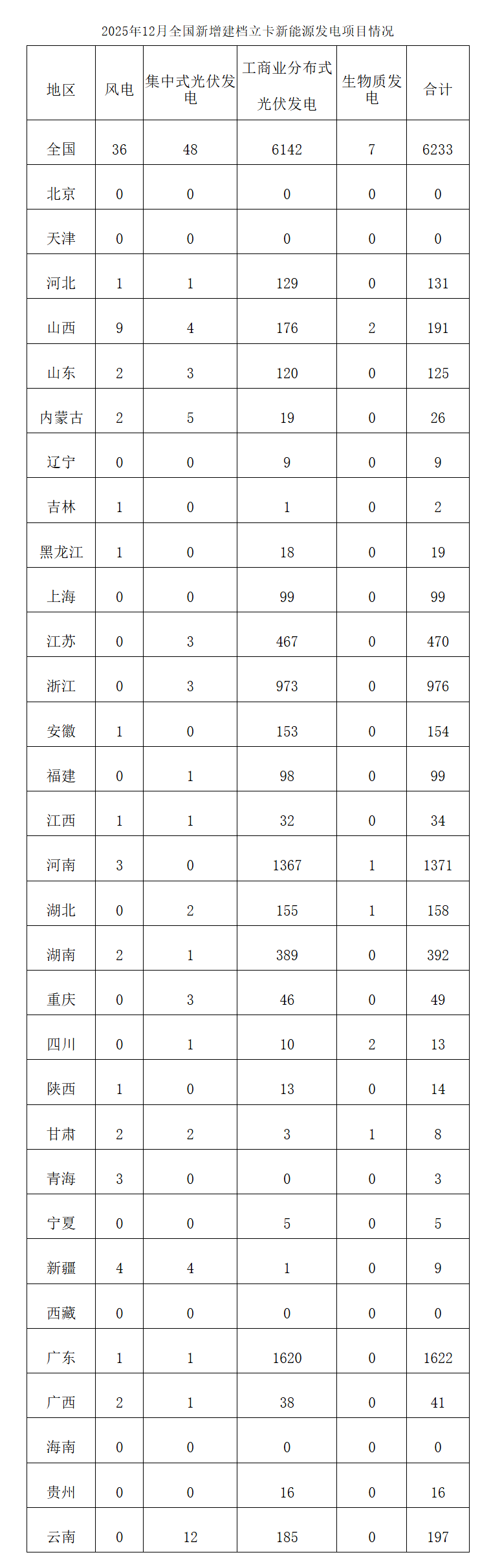 2025年12月,全國新增建檔立卡新能源發(fā)電(不含戶用光伏)項目共6233個,其中風(fēng)電項目36個,光伏發(fā)電項目6190個(集中式光伏發(fā)電項目48個,工商業(yè)分布式光伏發(fā)電項目6142個),生物質(zhì)發(fā)電項目7個。風(fēng)電、集中式光伏發(fā)電、生物質(zhì)發(fā)電項目清單見附件,工商業(yè)分布式光伏發(fā)電項目清單詳見國家可再生能源發(fā)電項目信息管理平臺網(wǎng)站(網(wǎng)址https://jdlk.renewable.org.cn/card-info-sheet/)。
