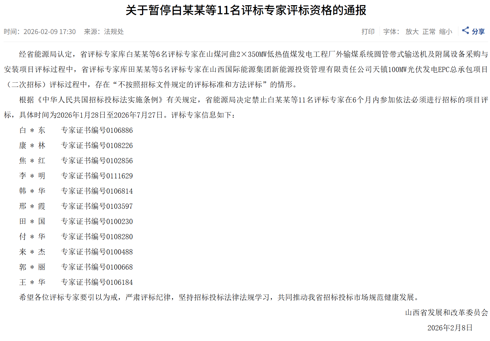 根據(jù)《中華人民共國招標(biāo)投標(biāo)法實(shí)施條例》有關(guān)規(guī)定,省能源局決定禁止白某某等11名評(píng)標(biāo)專家在6個(gè)月內(nèi)參加依法必須進(jìn)行招標(biāo)的項(xiàng)目評(píng)標(biāo),具體時(shí)間為2026年1月28日至2026年7月27日。