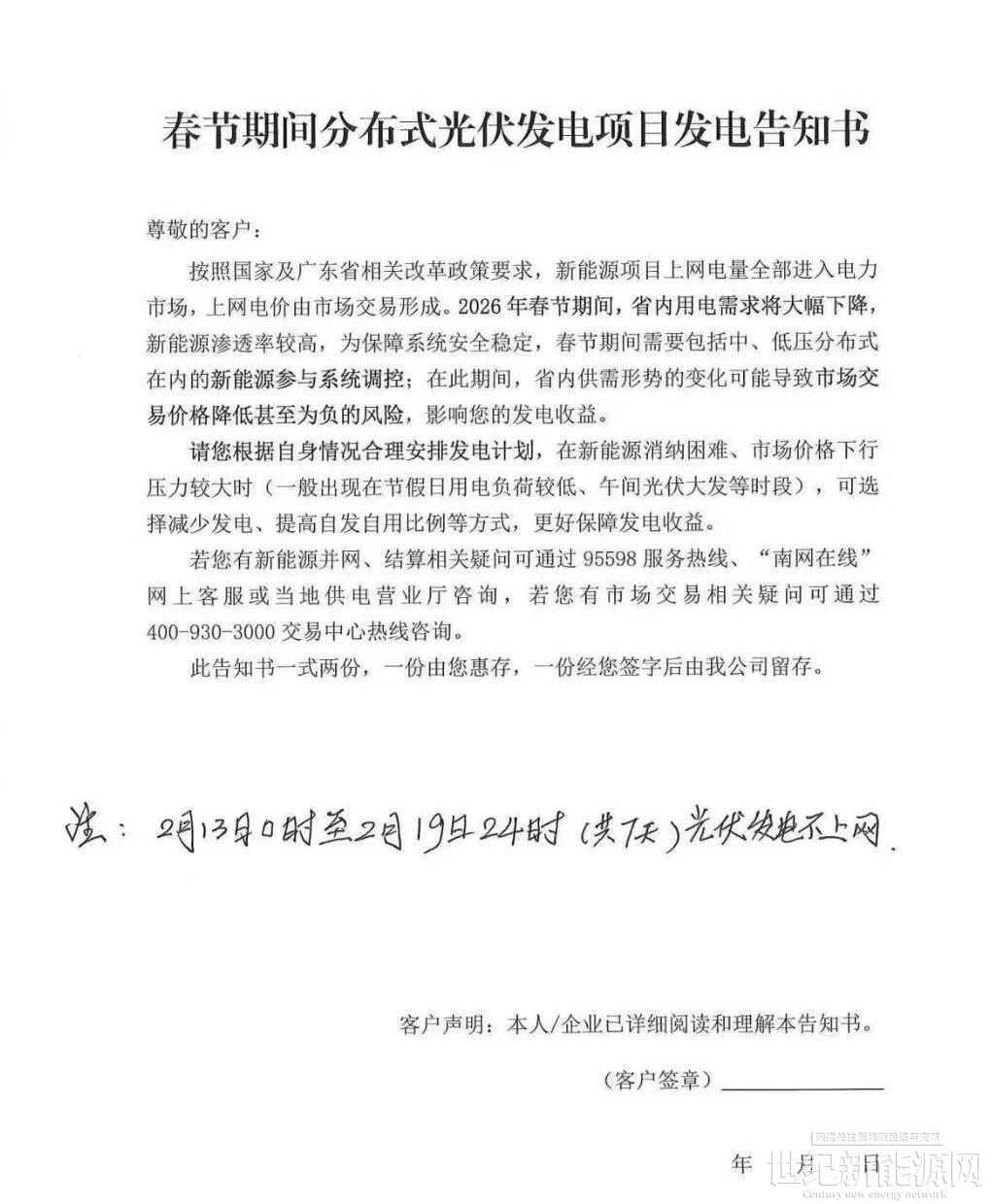 近日,一則由南方電網(wǎng)廣東地區(qū)發(fā)布的《春節(jié)期間分布式光伏發(fā)電項目發(fā)電告知書》在光伏從業(yè)者的社交圈中廣泛傳播。該告知書指出,在2026年春節(jié)期間,廣東省內(nèi)的中、低壓分布式光伏發(fā)電項目需配合系統(tǒng)進行調(diào)控,并特別說明,從2月13日0時起至2月19日24時止的這七天內(nèi),光伏發(fā)電將不并入電網(wǎng)。