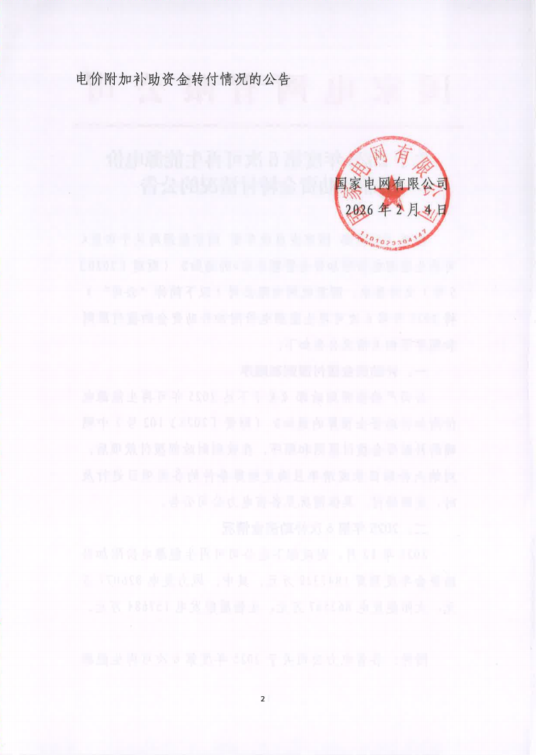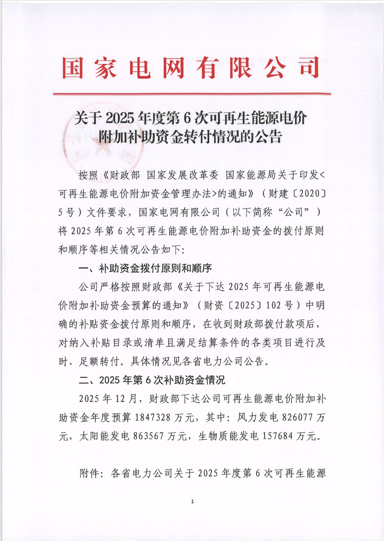 2月24日,國(guó)家電網(wǎng)有限公司發(fā)布了關(guān)于2025年度第6次可再生能源電價(jià)附加補(bǔ)助資金轉(zhuǎn)付情況的公告。
