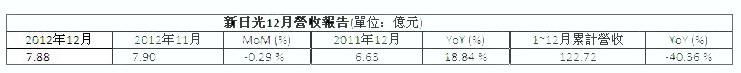 新日光12月?tīng)I(yíng)收?qǐng)?bào)告(單位:億元)