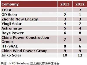 晶科可能是唯一一家新進(jìn)入前十位排行榜的企業(yè)。2013年晶科在中國市場計(jì)劃實(shí)現(xiàn)兩個700MW的目標(biāo),即中國區(qū)出貨量超過700MW和國內(nèi)市場光伏電站項(xiàng)目儲備超過700MW。