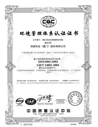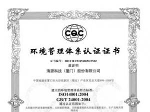 2013年10月,中國(guó)質(zhì)量認(rèn)證中心(CQC)正式審核確認(rèn)清源科技(廈門(mén))股份有限公司順利通過(guò)ISO 14001:2004環(huán)境管理體系認(rèn)證,并頒發(fā)了認(rèn)證證書(shū),標(biāo)志著清源科技的企業(yè)環(huán)境管理、研發(fā)、設(shè)計(jì)、生產(chǎn)水平更上一層樓。