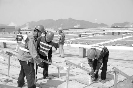 工人在申洲廠房屋頂安裝光伏設(shè)備。(馮瑄周律攝)