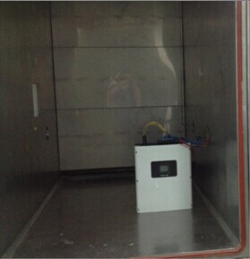 淋雨試驗在一個大的溫濕度箱進行的,有專門設備控制噴淋的大小和方向,逆變器在70℃/95%溫濕度工作一段時長后,對逆變器外殼噴淋涼水。實驗前在逆變器內(nèi)部單板、外殼內(nèi)側(cè)壁、關(guān)鍵器件、散熱器等關(guān)鍵部位貼濕敏試紙,對比試驗前后試紙顏色變化,來判斷是否有凝露發(fā)生。整個試驗過程中,逆變器帶電運行,實時遠程監(jiān)控運行狀態(tài)。