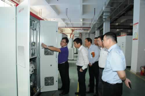 徐力群市長(左二)、馬如興局長(左三)在何思模教授(右一)的陪同下參觀逆變器總裝車間